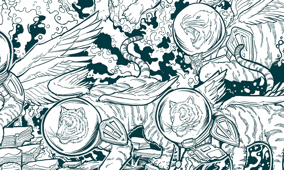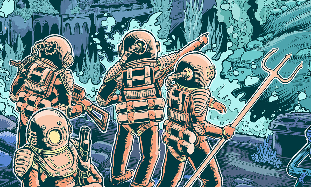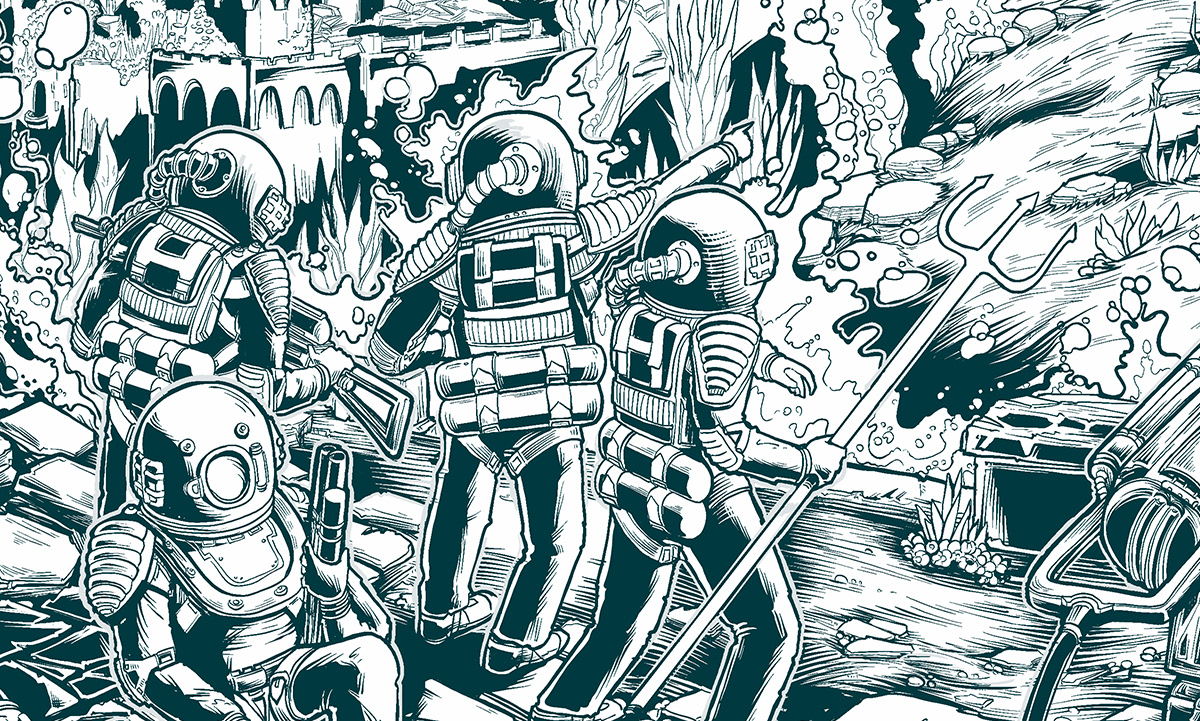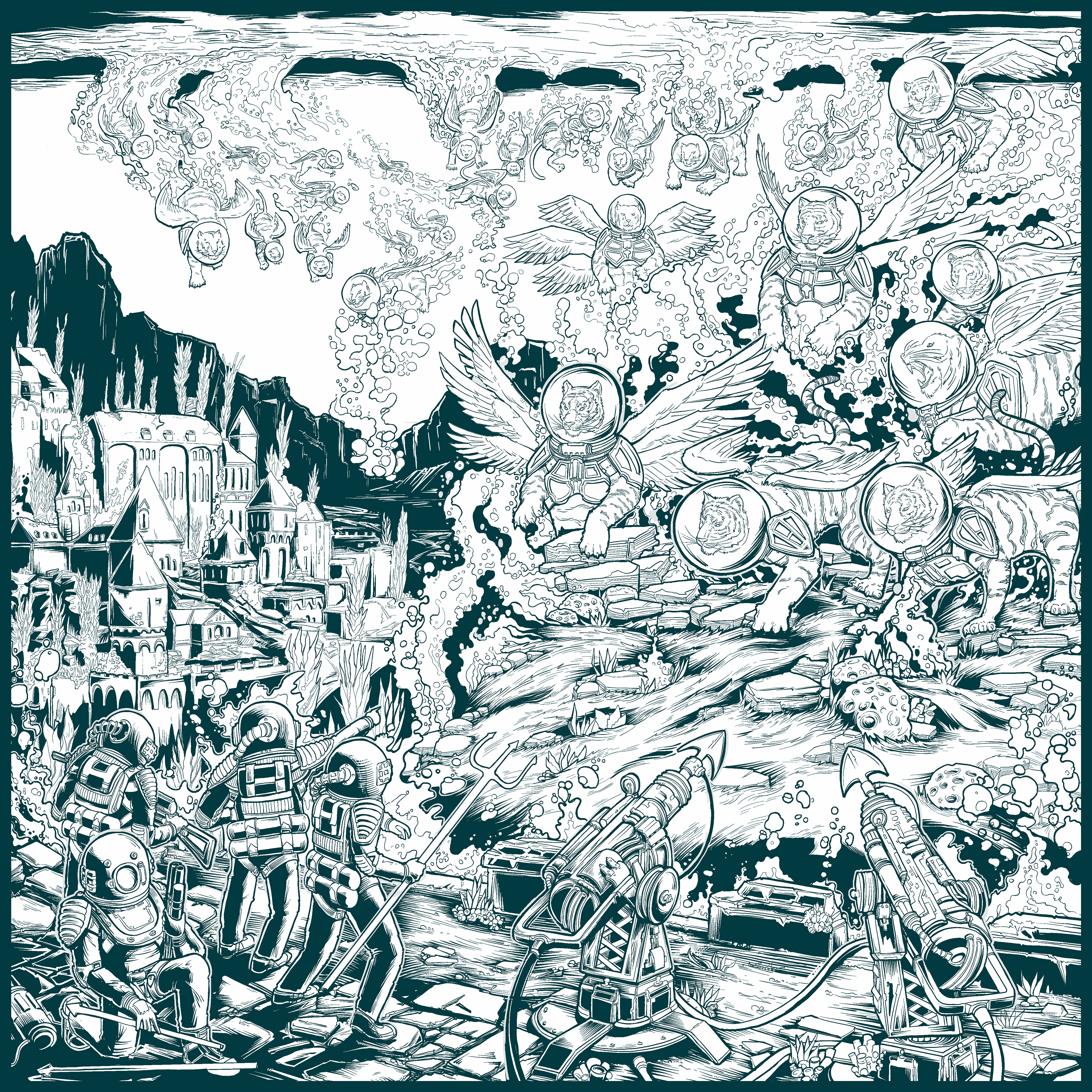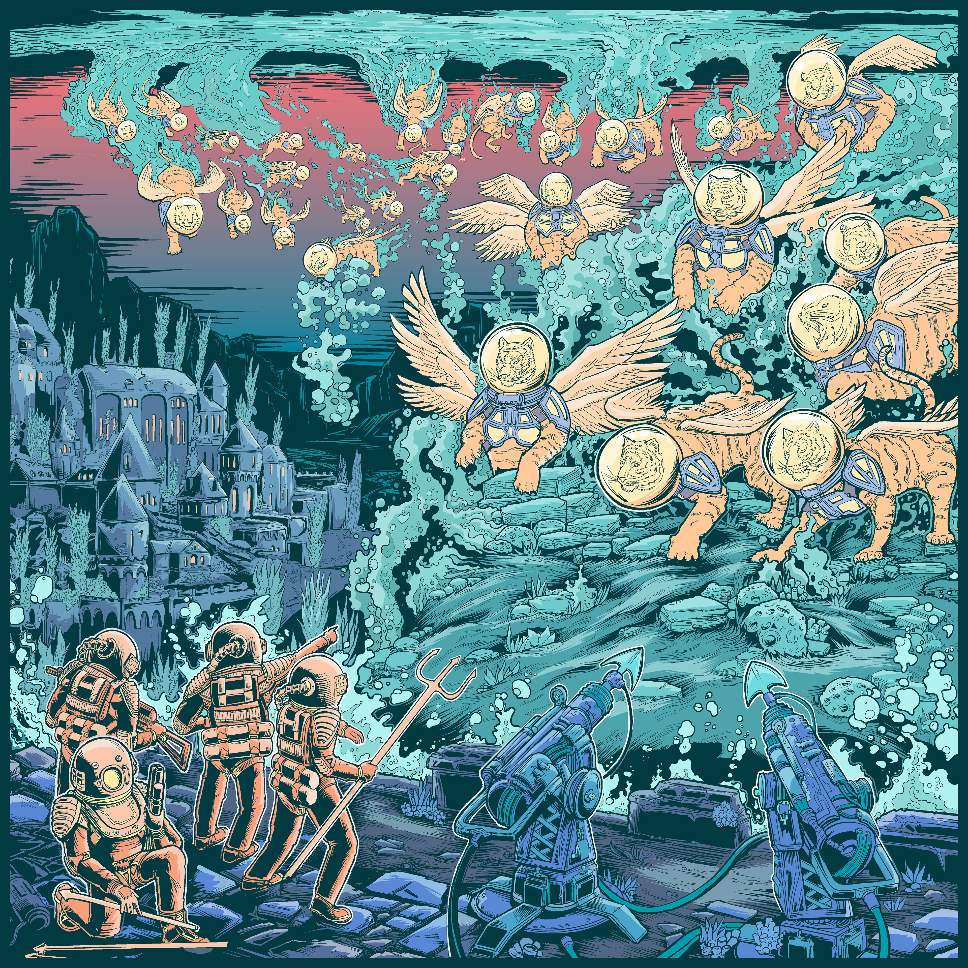 Illustration for the Prog-Rock group Challenger Deep for dual single release of Like Giving Wings and Hollowed Bastion. The prompt was "Underwater fight between a horde of flying tigers and 4 divers defending a castle."