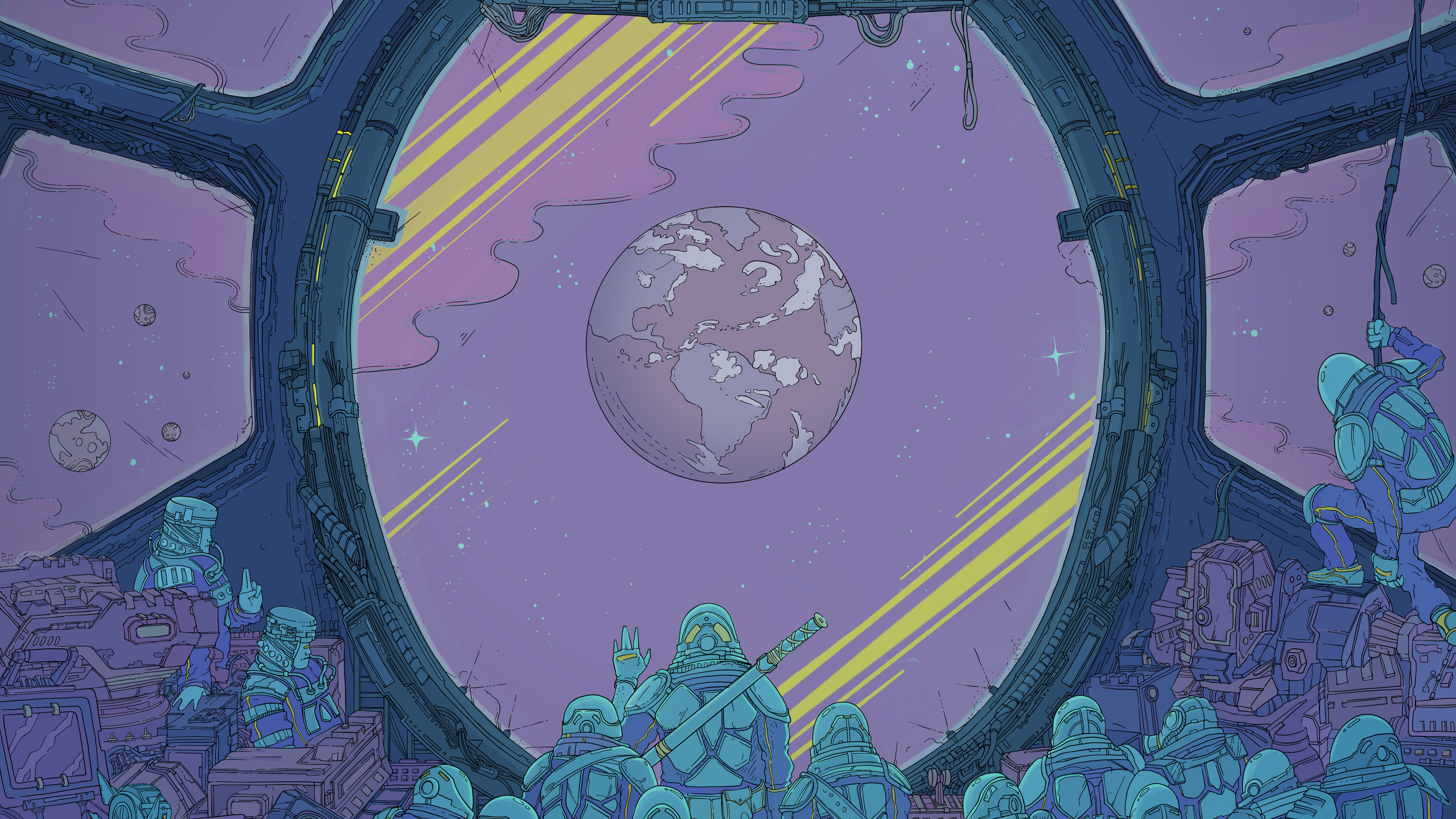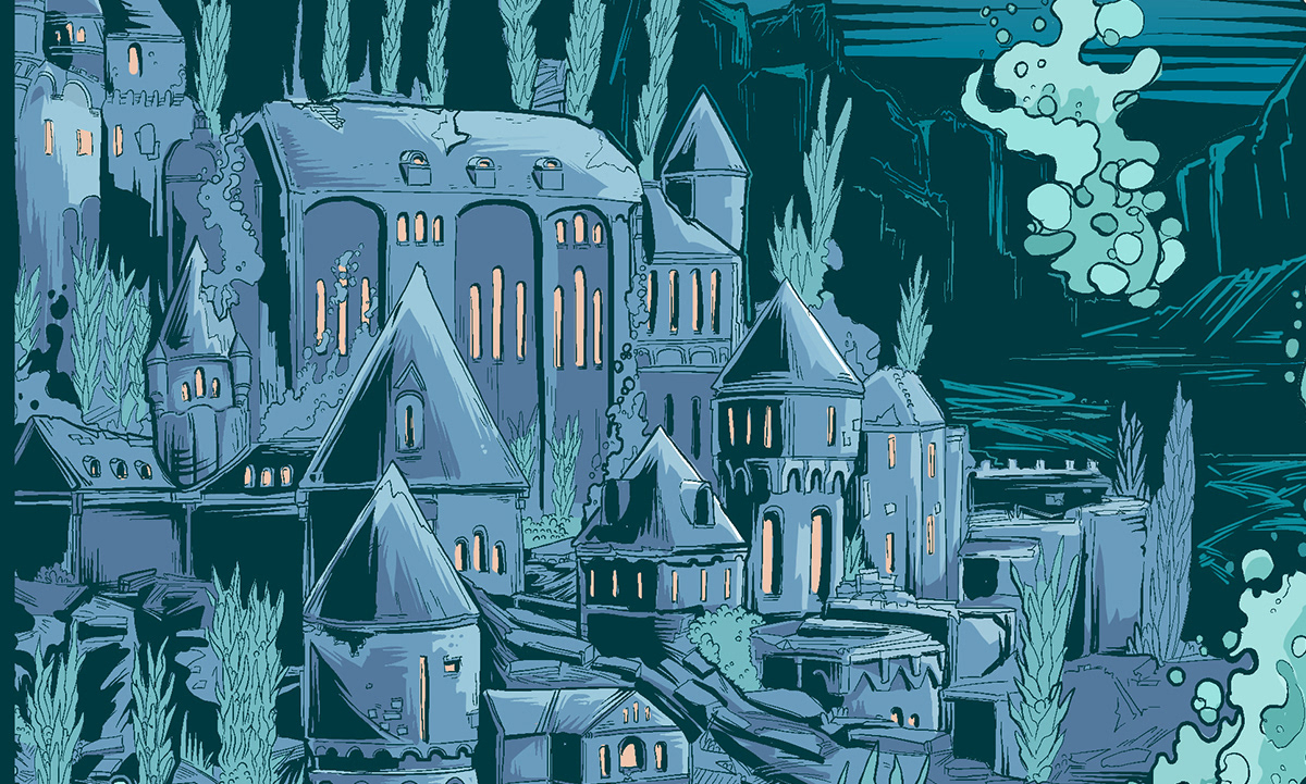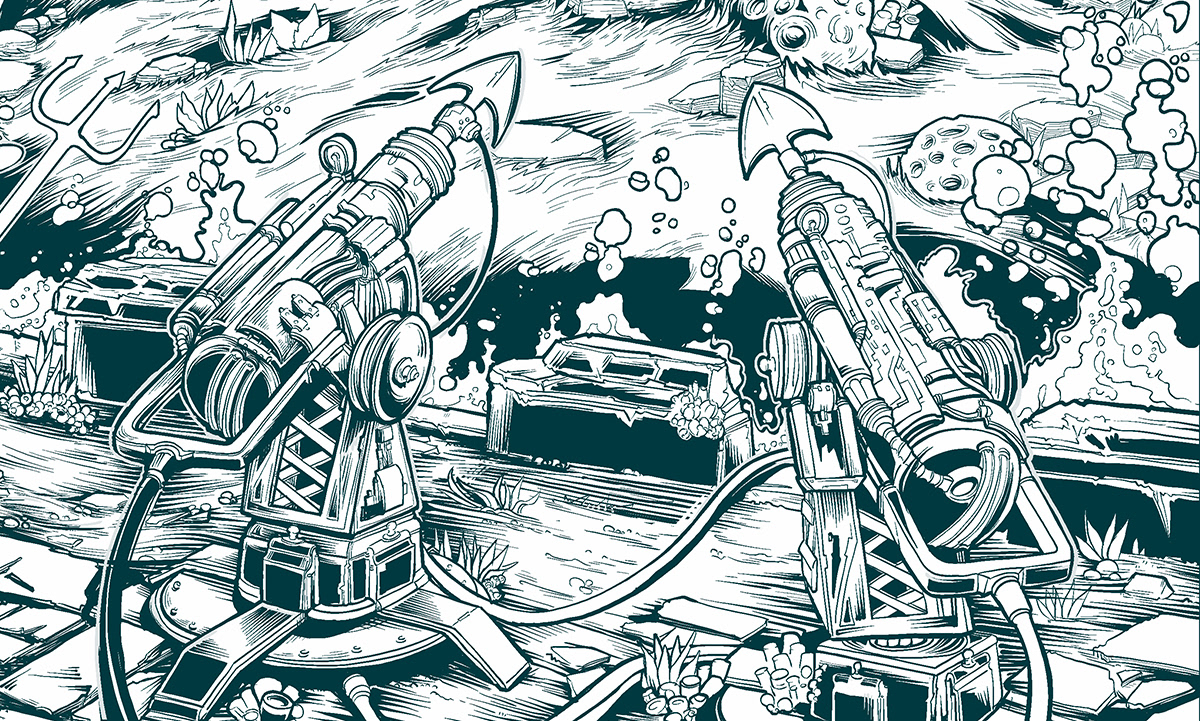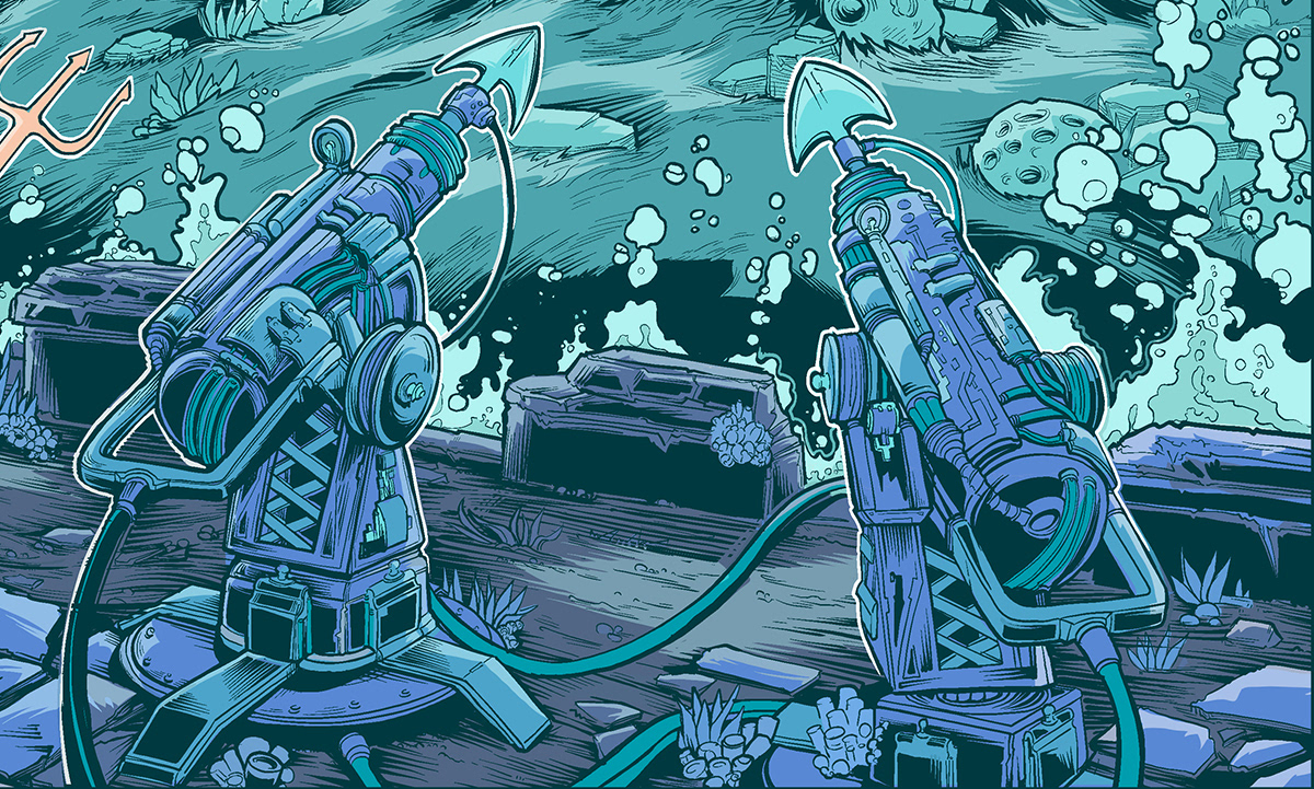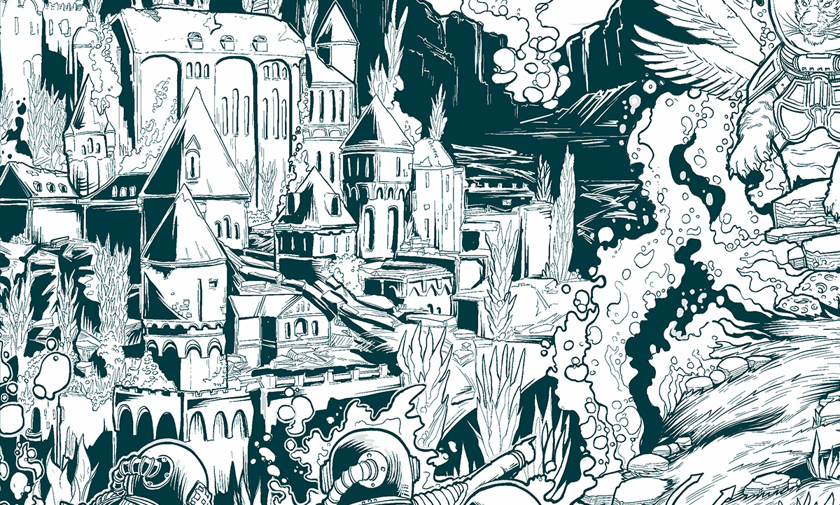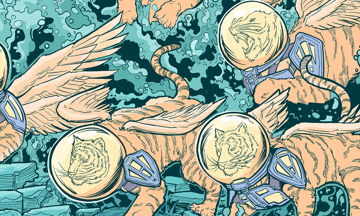 Illustration for the Prog-Rock group Challenger Deep for dual single release of Like Giving Wings and Hollowed Bastion. The prompt was "Underwater fight between a horde of flying tigers and 4 divers defending a castle."