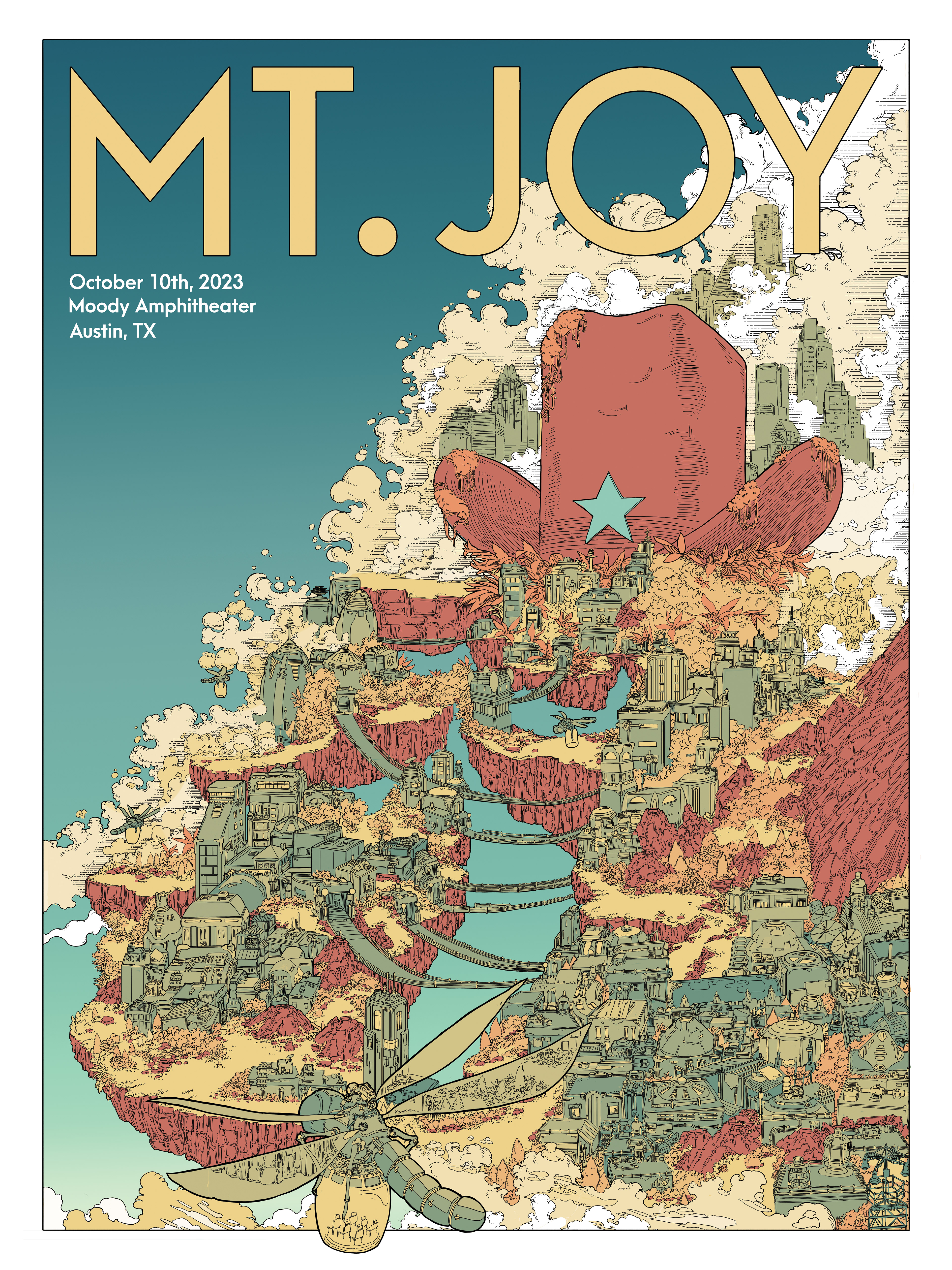 Poster for Mt. Joy live at Moody Amphitheater. Poster illustration by Taylor C Adams. Printing by Firecrest Press.