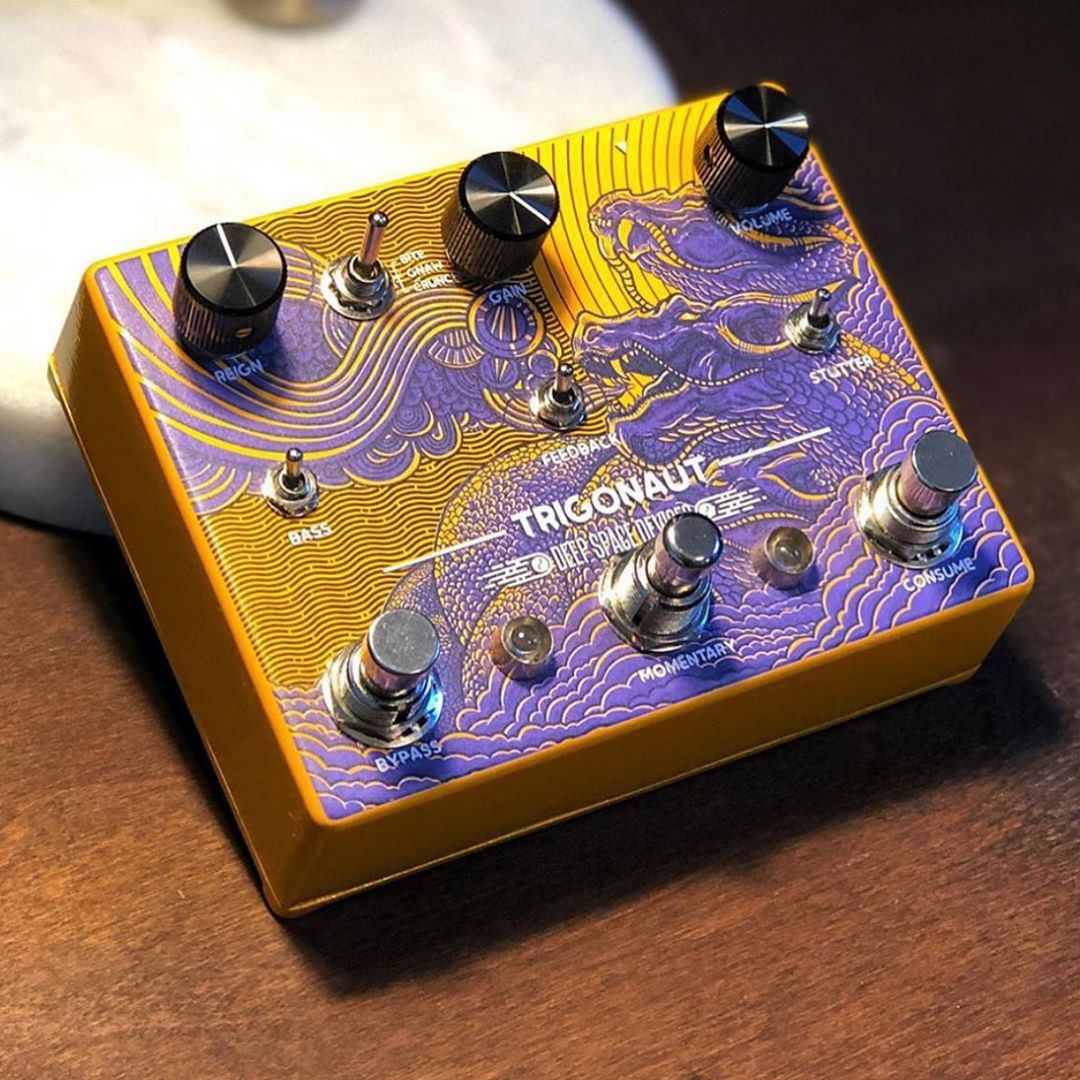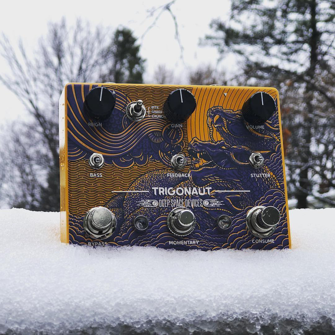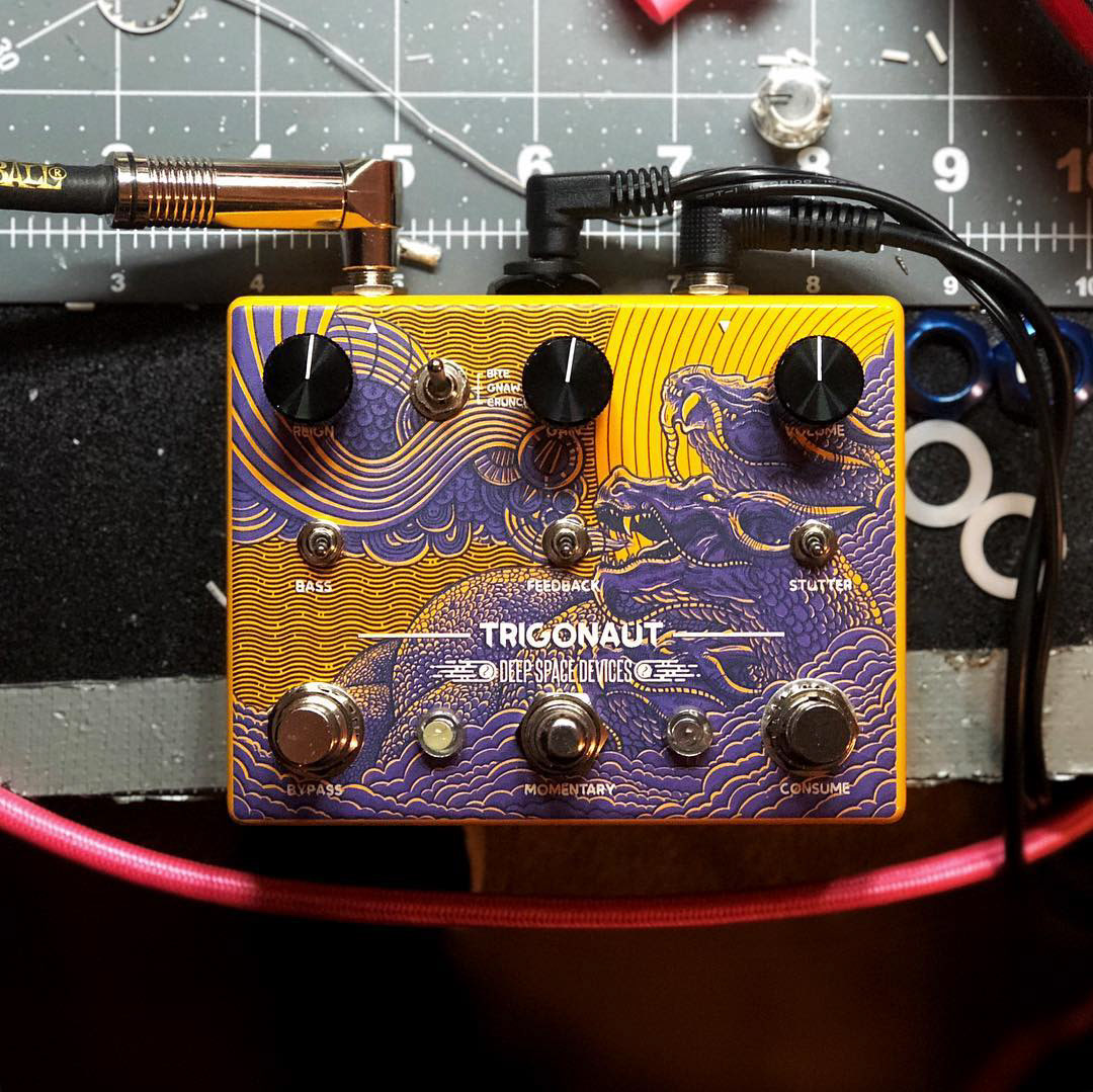 The third guitar pedal from Deep Space Devices. The Trigonaut is an overdrive pedal with octave glitch/stutter capabilities where the octaves perform the glitch/stutter effect.