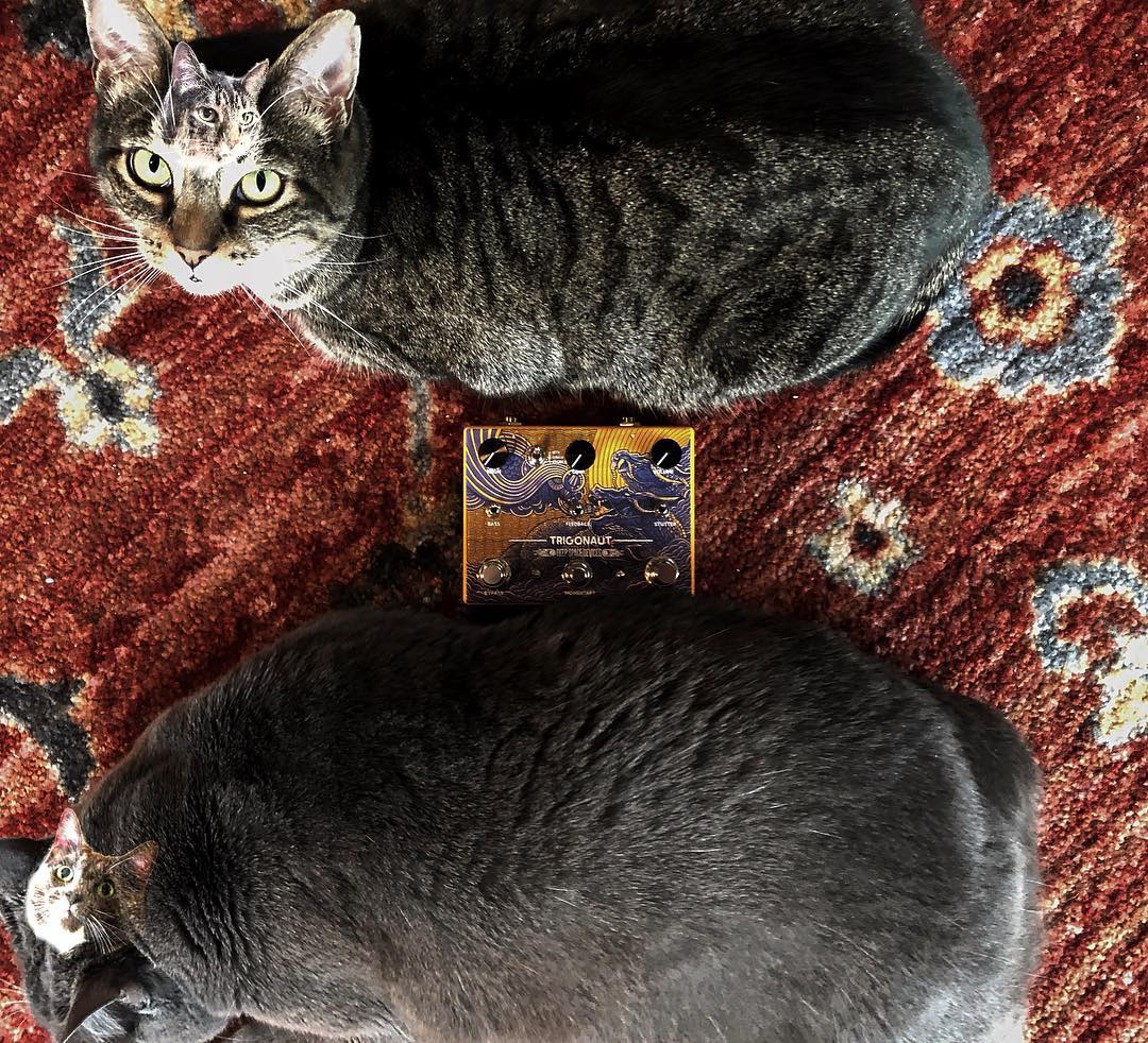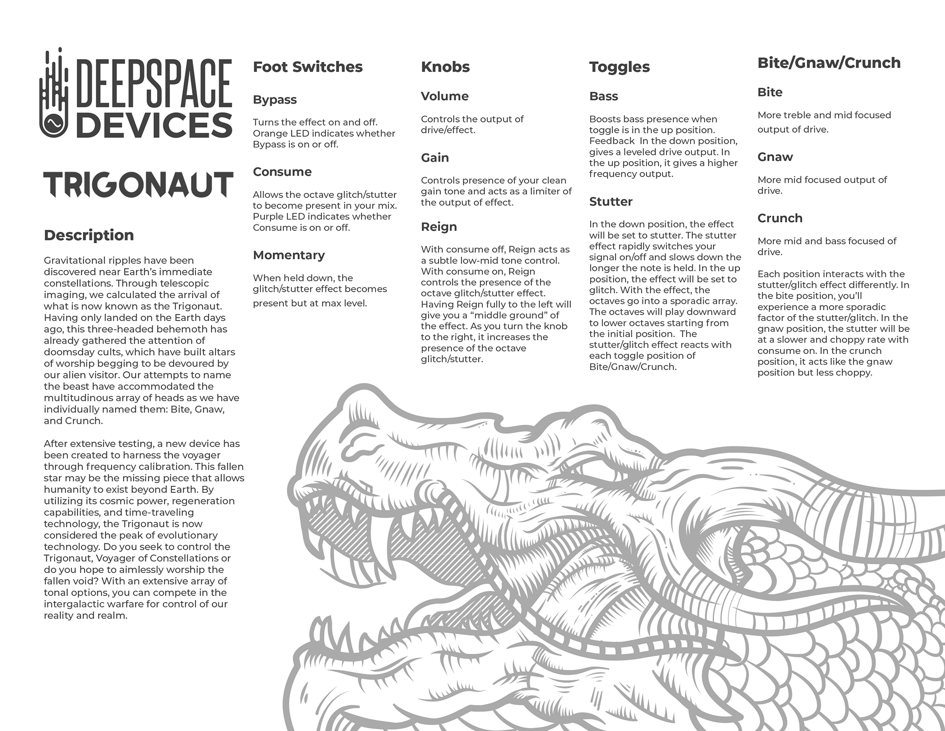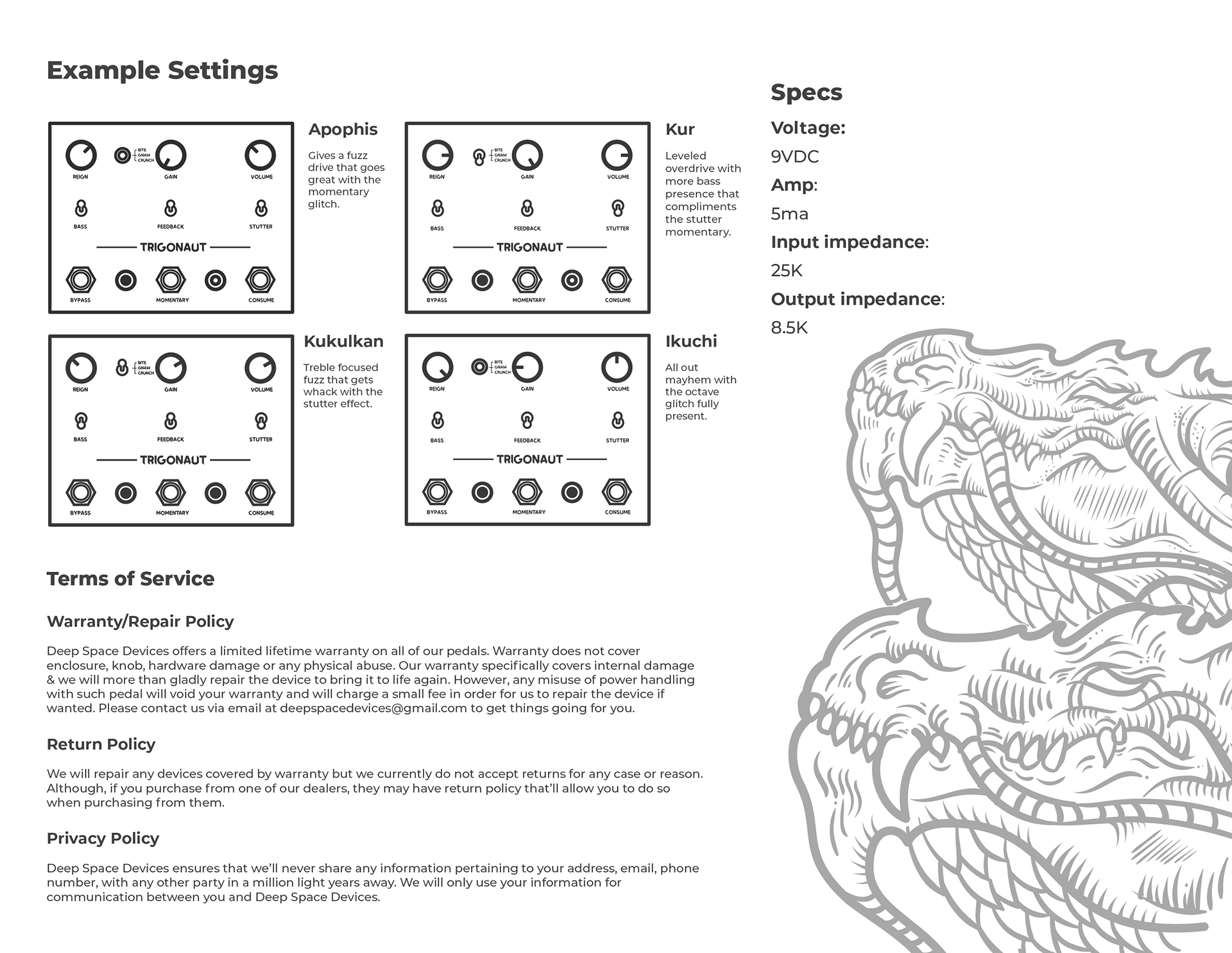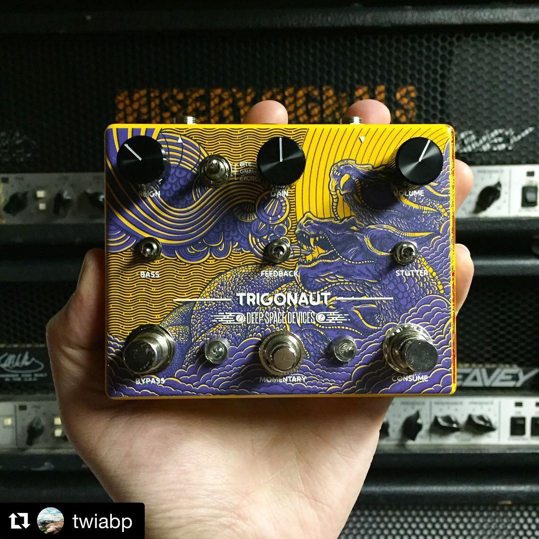 The third guitar pedal from Deep Space Devices. The Trigonaut is an overdrive pedal with octave glitch/stutter capabilities where the octaves perform the glitch/stutter effect.